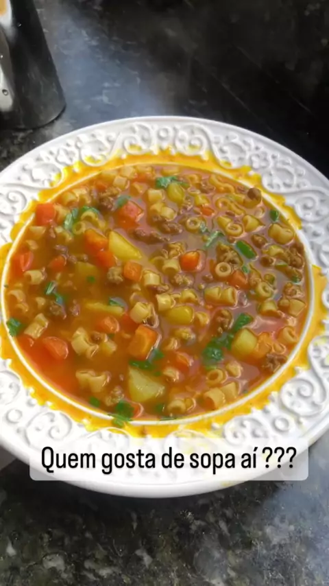 Sopa de carne moída com batata, cenoura e macarrão . . Primeiro eu tempero a carne e frito, depois coloco coloral e açafrão e já coloco a batatinha e a cenoura e a água e deixo cozinhar até amolecer . Por último o macarrão e deixo cozinhar mais uns 12 minutinhos até amolecer . Acerto o sal e encerro com cheiro verde . #temcabareessanoite #paixaonacional #kwaicriador