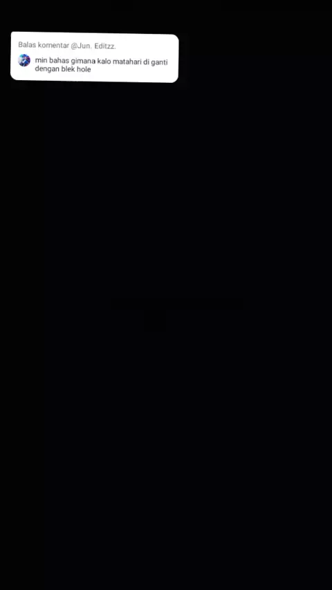 Menanggapi pada @Jun. Editzz.(O150001707275821) dah ya. jadi gini *Apa yang terjadi?* Jika Matahari diganti black hole dengan massa sama (1 M☉), efeknya: - *Gravitasi tetap*: Planet-planet tetap mengorbit seperti biasa - *Tidak ada cahaya*: Black hole tidak memancarkan cahaya, Bumi jadi gelap - *Suhu turun drastis*: Tanpa sinar Matahari, Bumi jadi sangat dingin (-270°C) - *Hidup mustahil*: Fotosintesis berhenti, ekosistem kolaps