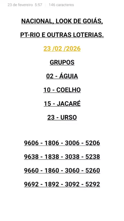 Palpites para o JB, valendo para todas as loterias do Brasil. #jogodobicho #loterianacional #lookloteria #loteriapopular #Lotep 23/02/2026