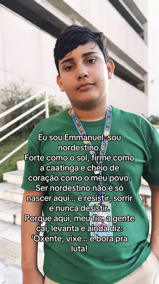 Eu sou Emmanuel, sou nordestino. Forte como o sol, firme como a caatinga e cheio de coração como o meu povo. Ser nordestino não é só nascer aqui… é resistir, sorrir e nunca desistir. Porque aqui, meu fio, a gente cai, levanta e ainda diz: ‘Oxente, vixe… e bora pra luta!’” #DiaDoNordestino #OrgulhoNordestino #EmanuelNordestino #SouNordestino #NordesteÉForça