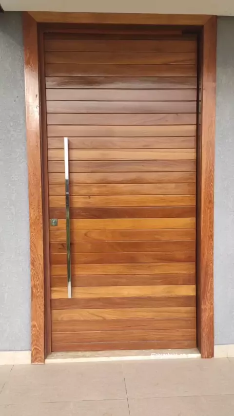 Porta de madeira maciça de 1,20m de largura por 2,50m de altura. Esse tipo de porta é feita com estrutura metálica interna para suportar o peso e distribuir melhor os esforços. Essa porta foi feita com madeira Ipê e com a folha da porta de 1,20mx2,50m acabado, já o portal foi feito com largura de 20,50cm e altura 2,55cm. O puxador cromado de 1,20m Fechadura rolete de duplo cilindro de 80mm Pino pivotante de 400kg para fixação e rotação da porta Gostou, segue, curta e compartilhe #porta #😎ob
