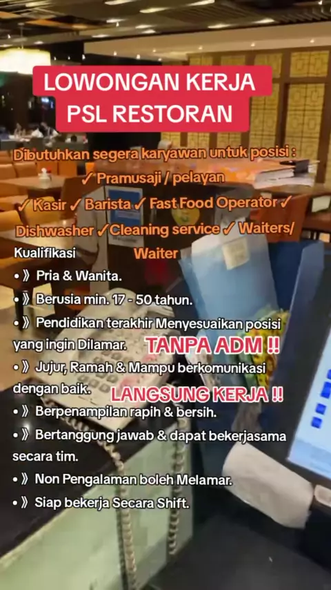 LOWONGAN KERJA UNTUK RESTORAN DI JAKARTA BENEFIT & FASILITAS : • 》Gaji Pokok 4.0 - 4.8 Perbulan. • 》Uang Makan & Transport 35 - 50 rb perhari. • 》Bonus Service & Bonus Lemburan. • 》Tunjangan Kesehatan • 》Penempatan sesuai DOMISILI (Daerah Jabodetabek). • 》Mess / Tempat Tinggal (bagi yang dari luar kota).#restoran#infoloker#loker2024#lokerresto#waiters#pasti