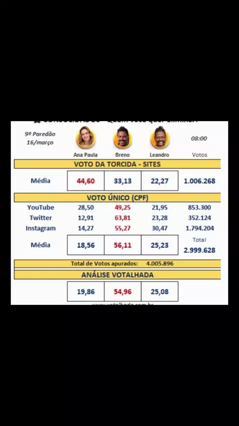 Primejro resultado parcial de enquete do paredão mostra Breno sendo eliminado na disputa contra Ana Paula e Boneco. #BBB #BBB26 #Globo #Paredão