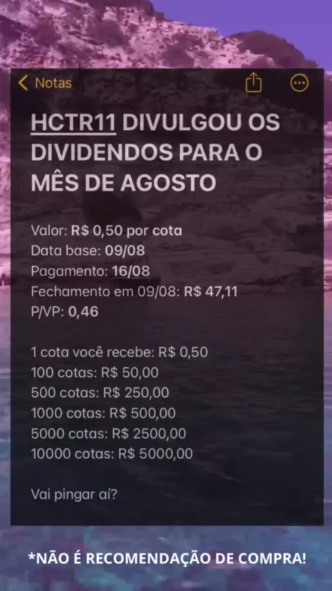 HCTR11 divulgou hoje os dividendos para o mês de agosto! Vai pingar aí? 💰 #dividendos #rendaextra #FIIS #fy #fyp