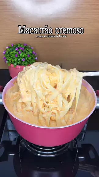 Macarrão cremoso com creme de batata e frango.