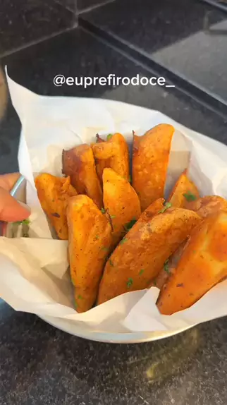 Batata frita com casquinha crocante 🤤🥔 3 batatas grandes partidas em formato de canoa 1 xícara de farinha de trigo 3 colheres de sopa de amido de milho 1 colher de chá de sal 1 colher de chá de alho em pó 1 colher de chá de cebola em pó 1 colher de chá de páprica defumada 1 colher de chá de orégano Aprox 3 colheres de sopa de ketchup 1 xícara de água #BatataFrita #receitas #Comida #fy #fyp