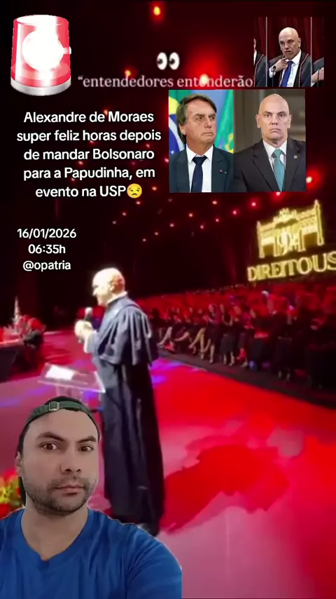 Alexandre de Moraes, super feliz horas depois de mandar Bolsonaro para a Papudinha, em evento na USP em São Paulo. #AlexandredeMoraes #usp #BOLSONARO #PRISÃO #papudinha