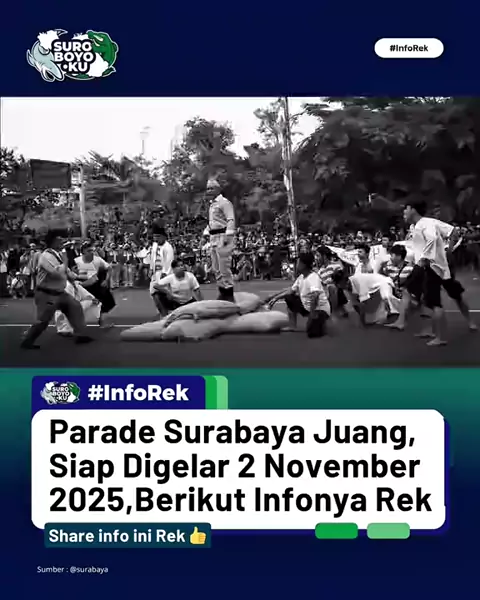 ARE YOU READY??? π₯ Parade Surabaya Juang akan hadir lagi di momen peringatan Hari Pahlawan 2025 Rek! Pastikan kalian gak kelewatan event yang cuma dimiliki oleh Kota Pahlawan ini rek π Save the date! ποΈ Minggu, 2 November 2025 Start pukul 14.00 WIB dari Tugu Pahlawan dan finish di Balai Pemuda Share Info ini Rek π€ #banggasurabaya #surabaya #suroboyoku #surabaya #paradejuang2025