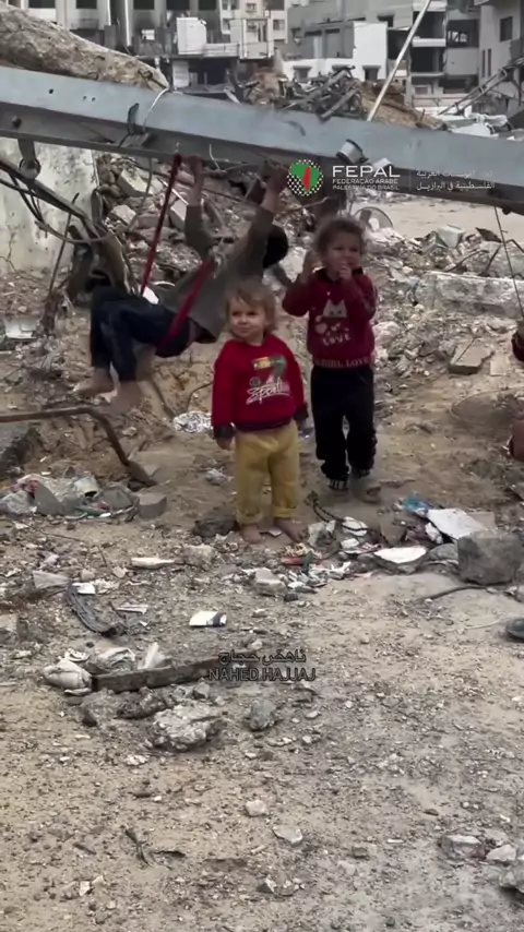 Descalças, crianças palestinas brincam em balanço improvisado nos escombros de Gaza. Dia 794 do Holocausto Palestino.