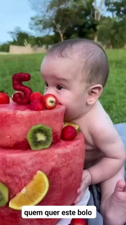 bebê comendo bolo de melancia #frutas #Criança #kawaiagosto #bebesfofos #criançafeliz