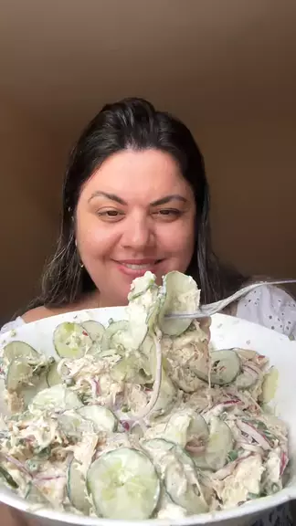 🥗 Salada cremosa de pepino com frango 🥗 Refrescante, leve e perfeita pra qualquer hora do dia! Fácil, rápida e cheia de sabor 😍 🧺 Ingredientes: • 2 pepinos 🥒 • 1 cebola roxa grande 🧅 • 200 g de peito de frango cozido e desfiado 🍗 • 300 g de cream cheese 🧀 • Sal a gosto • Suco de 1 limão 🍋 • Molho inglês a gosto 🥄 Uma salada diferente, cremosa e muito gostosa! Salva essa receita pra fazer ainda hoje e me conta o que achou 💬💚 #saladacremosa #saladadepepino #frangodesfiado #receitafá
