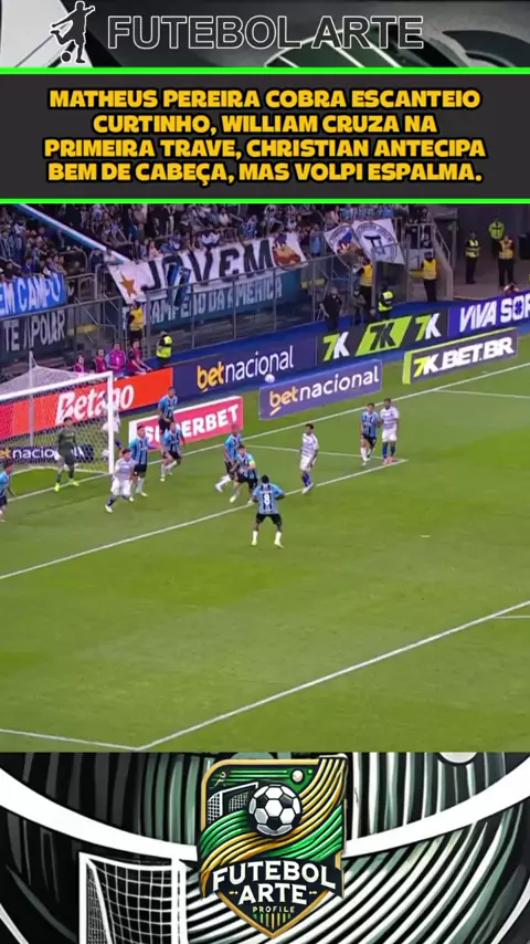 Matheus Pereira cobra escanteio curtinho, William cruza na primeira trave, Christian antecipa bem de cabeça, mas Volpi espalma.#brasileirão2025 #gremioxcruzeiro #Cruzeiro #Gremio #Esporte