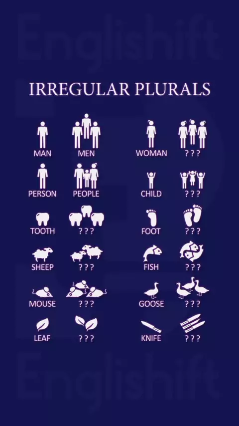 Irregular plural nouns are nouns that do not become plural by adding -s or -es, as most nouns in the English language do. You’re probably familiar with many of these already. #learningenglish #englishlearningonline #speakingenglish #Stage #fluentenglish #learnenglish #englishclass