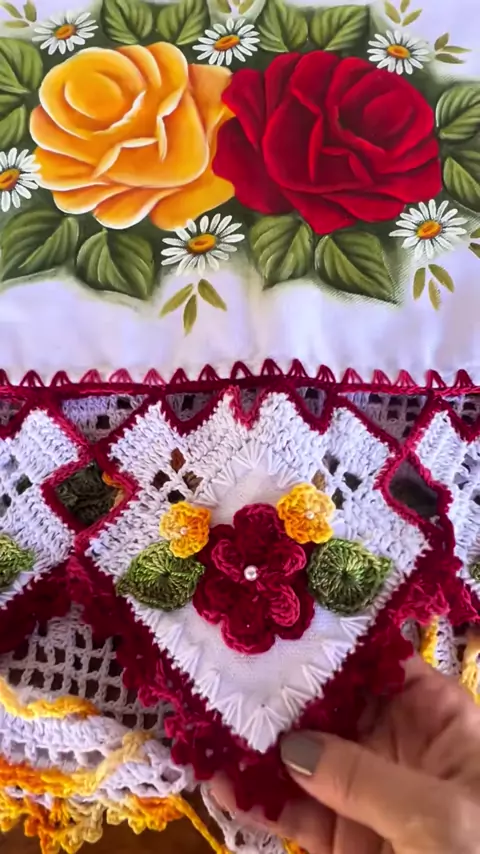 Panos de prato pintado a mão com barrado em crochê 🧶 #croche #panodeprato #donadecasa #panodecopa