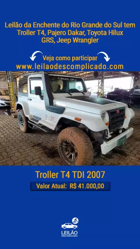 Leilão da Enchente do Rio Grande do Sul tem Troller T4, Pajero Dakar, Toyota Hilux GRS, Jeep Wrangler 👉Veja como participar: https://leilaodescomplicado.com/ Entre os veículos Tem: Toyota Hilux 2022, Valor Atual R$ 114.900,00 Toyota Hilux 2022, Valor Atual R$ 98.000,00 Mitsubishi Pajero Dakar 2011/2012, Valor Atual R$ 29.500,00 Chevrolet S10 HC 2020/2021, Valor Atual R$ 58.000,00 Chevrolet S10 Advantage 2009/2010, Valor Atual R$ 16.500,00 Troller T4 TDI 2007, Valor Atual R$ 41.000,00 Fiat Stra