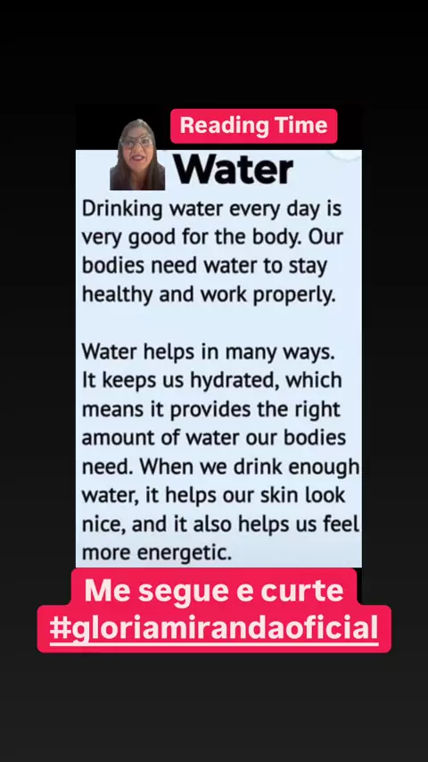 Reading Time!! Hora da leitura! Faça a leitura em inglês e veja se consegue entender o texto. Tradução do texto aqui embaixo 👇 Água Beber água todo o dia e muito bom para o corpo. Nossos corpos precisam de água para se manterem saudável e funcionarem corretamente. A Água ajuda de muitas maneiras. Ela nos manteve hidratados, o que significa que fornece a quantidade certa de água que nossos corpos precisam. Quando bebemos água suficiente, ela ajuda a nossa pele