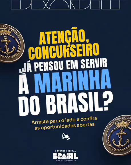 🚨 A Marinha do Brasil está com oportunidades em diversas áreas, de soldado a engenheira e engenheiro! ⚓ São vagas para diferentes níveis de escolaridade, contemplando áreas como engenharia, saúde, educação, tecnologia e muito mais. 🇧🇷 Uma chance de construir carreira enquanto contribui diretamente para a defesa do país e a soberania nacional. 👉Arraste para o lado e confira todos os detalhes. 👉E atenção: as inscrições são feitas exclusivamente em: concursos.marinha.mil.br
