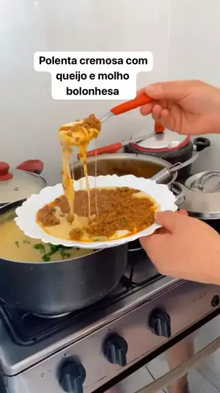 Polenta cremosa com queijo e molho bolonhesa #polenta #Receita #food #fy #fyp . . Ingredientes 4 xícaras de fubá amarelo ou branco 3 litros de água 4 dentes de alho 1 cebola Sal e pimenta a gosto Molho de carne moída 2 kg de carne moída 2 cebolas picadas 6 dentes de alho 4 tomates picados 1 litro de molho de tomate Sal e pimenta a gosto