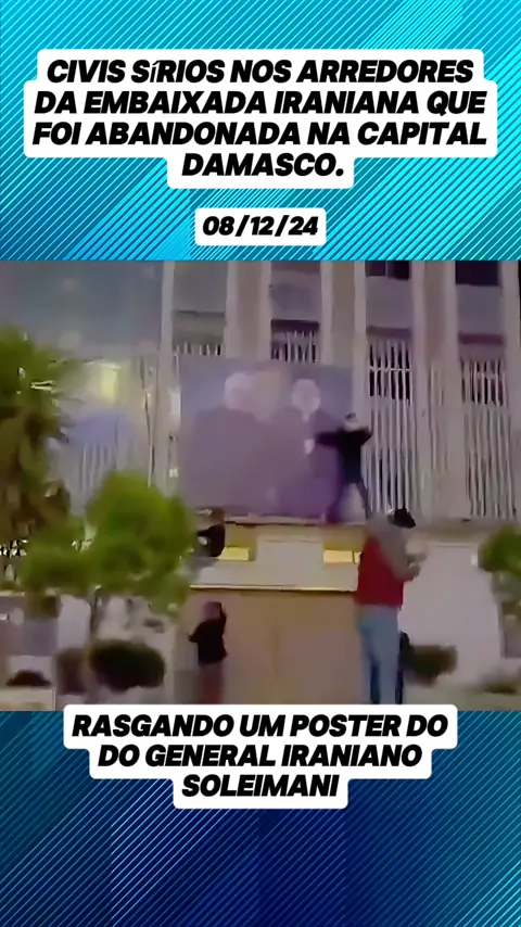 Civis sรญrios nos arredores da embaixada iraniana que foi abandonada na capital Damasco. ร possรญvel observar um civil tentando arrancar da entrada da embaixada a foto do general iraniano Soleimani, morto por um drone dos EUA em janeiro de 2020. #QuedaDeBasharAlasaad #guerracivil #siria #KWAINOTICIAS #ultimasnoticias