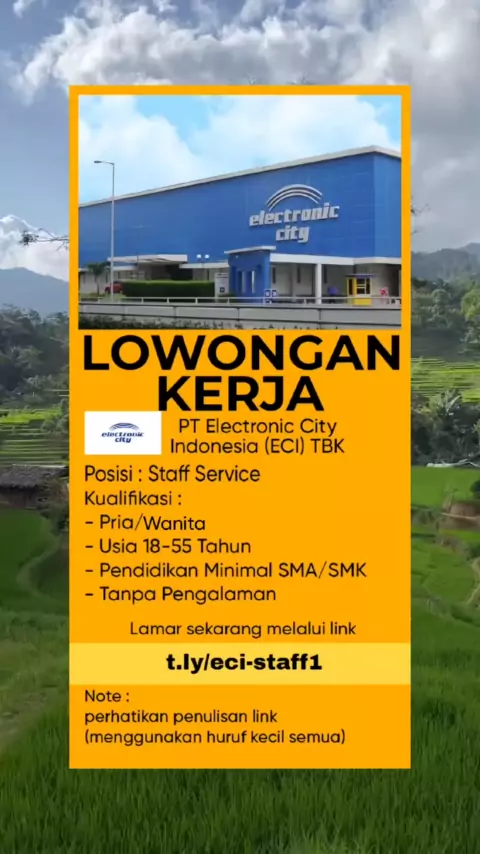 LOKER LULUSAN SMA/SMK Staff Service PT Electronic City Indonesia (ECI) TBK#lowongan2024#infoloker2024#loker2024#lokersmasmk#loker#lowongankerja#infoloker#lowongan#lokerterbaru#lokerpabrik#carikerja#buruhpabrik#lowonganterpadu#pl#official
