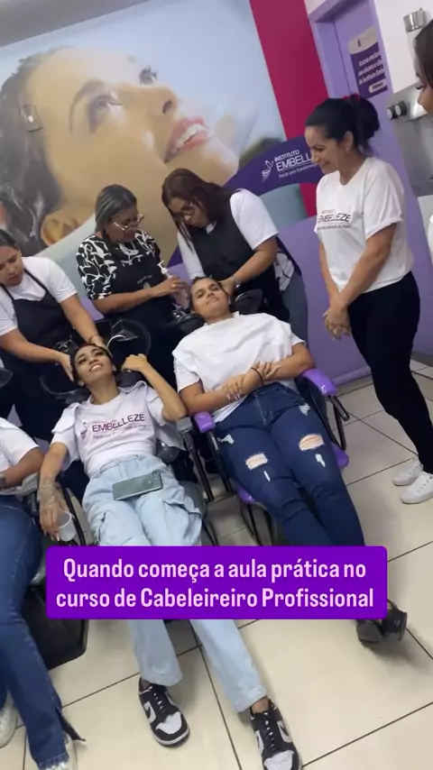 Turma de Cabeleireiro Profissional com a sua primeira aula prática de lavatório, onde estão lavando o cabelo uma da outra. Aula prática dinâmica. #CabeleireiroProfissional #Aulapratica #InstitutoEmbelleze #Embellezar #CuidandodoCabelo
