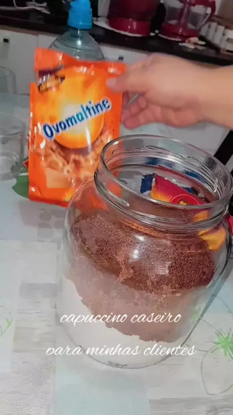 receita capuccino 400g de leite em pó 300g de ovomaltine 50g de café solúvel 1 colher de chá de bicarbonato de sódio, opcional #SupresaDePáscoaKwai #bebida More