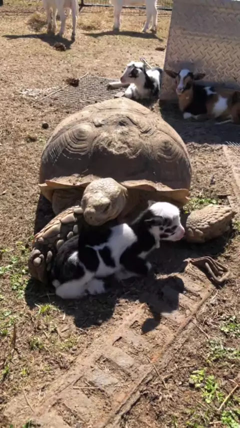 Uncle Ike teaching the new baby she’s protected # #babygoatsof #texas #tortoise #uncleike