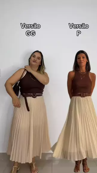 Look plus size estiloso com saia bege e blusa marrom, look fashion #moda #plussize #saiaplissada #fy