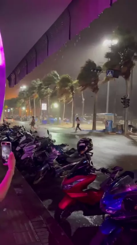 (5 de outubro de 2023) Fortes ventos atingiram as praias de Pattaya Choi, na província de Chonburi, Tailândia 🇹🇭 Antes de se dissipar, transformou-se brevemente em um tornado. Não foram relatados feridos, apenas danos leves.