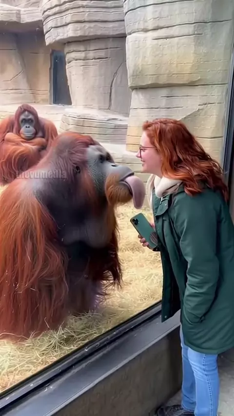 Um orangotango brincalhão no zoológico flerta com uma mulher através do vidro, estendendo a língua. Outro orangotango, assistindo com ciúme claro, dá uma pancada rápida na parte de trás da cabeça do flerte, criando uma cena hilariante e caótica. Este vídeo foi criado com Ai para entretenimento.