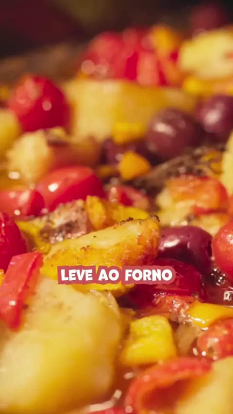 Bacalhau Português Ingredientes: - 1 kg de bacalhau em postas (dessalgado por 36h) - 1 pimentão amarelo (em tiras) - 1 pimentão vermelho (em tiras) - 1 cabeça de alho confitado - 2 cebolas médias (cortadas em rodelas) - 8 ovos cozidos (cortados ao meio) - 1 kg de batata (pré-cozida em rodelas grossas) - 3 pimentas dedo de moça (fatiadas) - 1 colher de café de cada: - orégano - lemon pepper - páprica picante - pimenta-do-reino - tomilho - 400g de tomate cereja - 1 vidro de azeitona pr