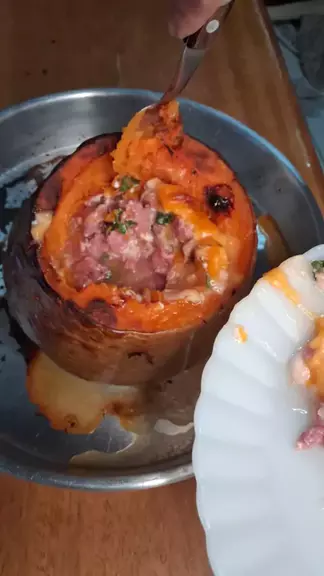 A abóbora recheada linguiça no forno