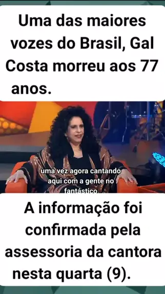 • Uma das maiores vozes do Brasil, Gal Costa morreu aos 77 anos. A informação foi confirmada pela assessoria da cantora nesta quarta (9). Em 2015, Gal completou 50 anos de carreira. Na época, ela falou sobre o projeto Estratosférica, com músicas inéditas, a maternidade e os clipes que fez ao longo da trajetória no Fantástico #galcosta #fantastico #Notícia #fofoca #autolegenda @Kwai Brasil Oficial(O558843093) @Radar Kwai BR(O150000043503131) @Kwai Comentário(O150001239356199)