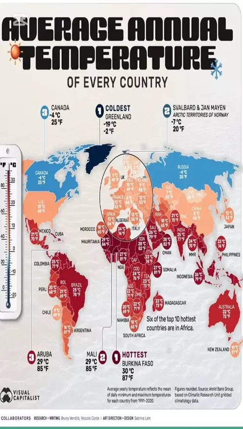 Temperatura media anual del aire por país Average annual air temperature by country CreatorRewards x PhysicalProducts x Tecnología x DigitalProducts x AITools x TechPlatforms #Tecnología #DatosClimáticos #ClimaGlobal #CambioClimático #TemperaturaMedia