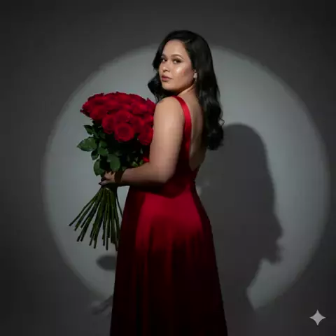 #Genimi #lA Texto Com base na minha foto, crie um retrato elegante de uma mulher confiante meio de costas com um buquê grande de rosas vermelhas na mão. Ela usa um elegante vestido longo vermelho com costas nuas, exalando sofisticação e poder. Seus cabelos pretos com ondas tamanho mediano fluem, e ela olhando meio de lado com uma expressão equilibrada e segura de si. A iluminação de circulo enfatizando ela no estúdio projeta sombras ousadas contra um fundo simples, criando um visual editorial at