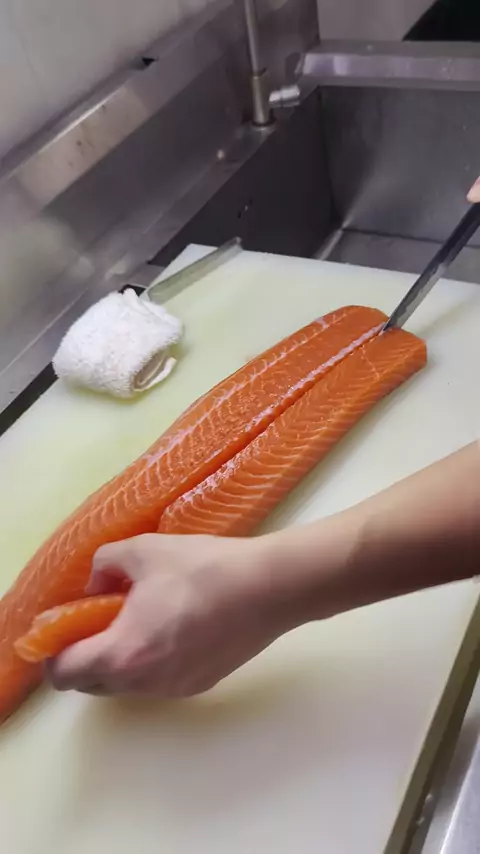 Cut the salmon into pieces. #kitchenknives #cheflife #asmr #messerforge