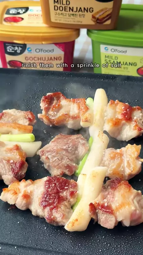 #ad easy korean dinner idea ✨ when life gets busy, every meal should still feel special. @ofoodusa’s traditional korean sauces make it easy to add both flavor and nutrition to everyday dishes. today i made pork belly skewers with a twist, each one seasoned with a different o’food paste. the skewers are layered with 2 pieces of pork belly, green onion, and a rice cake (soaked in hot water first so they turn soft and chewy). i cooked them on an electric griddle with no oil needed since the fat fr...