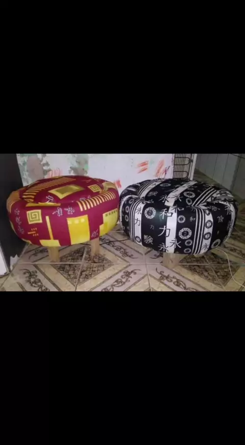 puff feito de pneu que serve para guardar sapatos e etc um aro 16 duas tábuas 40 cm cada um tecido na sua preferência grampeadora quatro pés um pedaço de colchão para o enchimento quatro parafusos