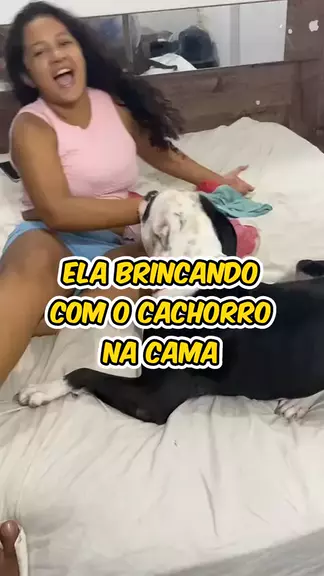 tá brincando com o cachorro na cama.