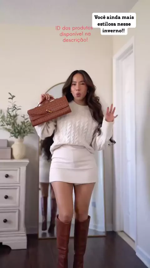 Ideia de conjunto estiloso para o Inverno !! shorts Saia ID: BNB-ZYS-CKE Blusa de tricô ID: BNB-HCD-CWY Bolsa transversal ID: BRJ-HKF-UDN Bota Montaria ID: ARM-XUN-QMU #bota #BLUSA #bolsa #shortssaia #viral
