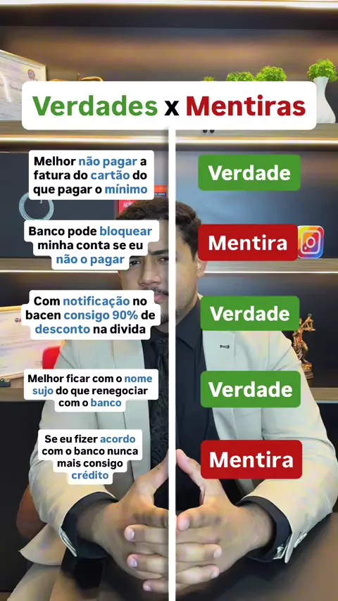 1- Verdade. Pagar o mínimo é adiar o atraso… você não vai conseguir pagar a próxima com juros. 2- Mentira! Só pode se te processarem e o juíz permitir. 3- Sim! Consegue até mais! 4- Exato. Renegociar triplica a sua dívida e adia o atraso. 5- Mentira! Faz a recuperação de crédito que ensino aqui que você consegue. Qual dúvida você quer ver aqui? Já segue @olucas_contrabancos #advogado #dívidas #direito Da mole não! Me segue @olucas_contrabancos ✅ #dívida #KwaiChef2025