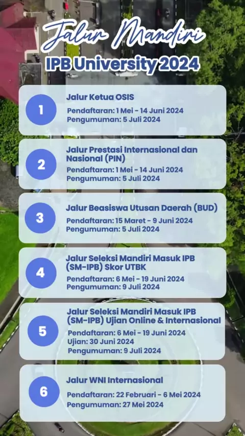 Semangat selalu, calon keluarga Kampus Terbaik! Kalau kata pepatah “banyak jalan menuju Roma”, khusus untuk kamu banyak jalur untuk jadi mahasiswa IPB University! Yuk catat tanggal-tanggal pentingnya agar langsung semangat belajar dan gas gak pake rem~#IPBUniversity#IPBNesian#KampusMerdeka#