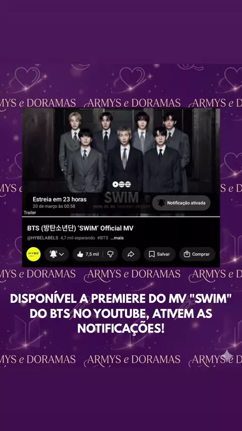 📸 | DISPONÍVEL A PREMIERE DO MV "SWIM" DO BTS NO YOUTUBE, ATIVEM AS NOTIFICAÇÕES!💜 Não perca a contagem regressiva especial com o BTS! 🏊♂️ 20 de março (sexta-feira) às 01:00 (BRT) 🖇:https://youtu.be/b4iVv91Z6lY?si=VD3c87iTau5tfc11