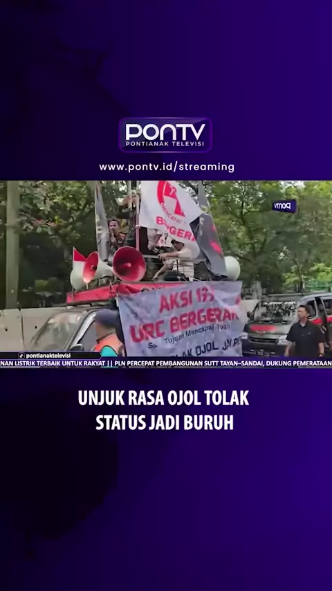 Ratusan pengemudi ojek online (ojol) dari berbagai aplikator menggelar aksi unjuk rasa di kawasan Medan Merdeka Selatan, Jakarta Pusat. Mereka menolak wacana penetapan status sebagai buruh atau pekerja tetap, serta keberatan atas potongan 10 persen oleh pihak aplikator.