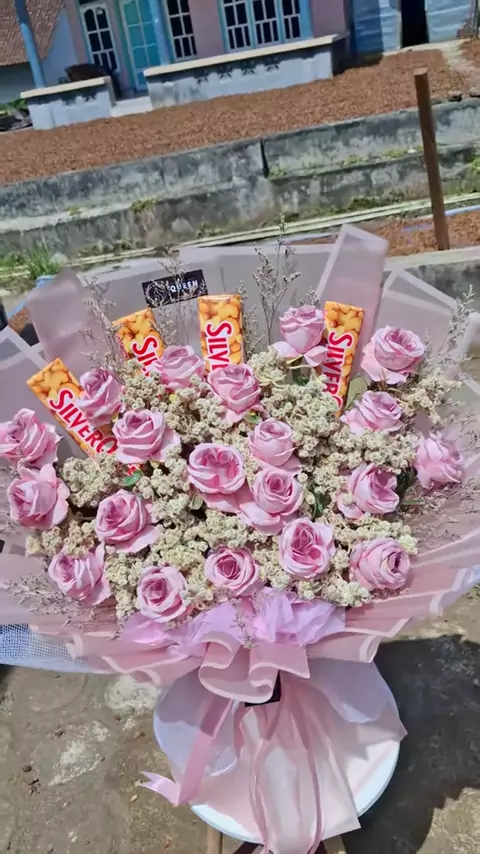 Buket bunga mawar artificial (palsu) + Bunga Edelweis + Coklat Silverqueen 💐✨️ #buketbunga #buketcoklat #buket valentine #buketkalibaru #buketbanyuwangi