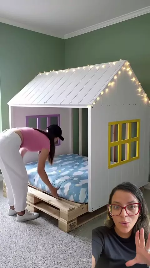 Nunca mais jogue paletes fora! Juntando as peças, você cria uma armação em formato de casinha, pinta, coloca LED e finaliza com um colchão confortável. Pode virar uma linda caminha ou um cantinho de brincar cheio de charme. Criativo, econômico e cheio de personalidade. Você faria? #diy #decoracaoinfantil #paletes #ideiascriativas #facavocemesmo