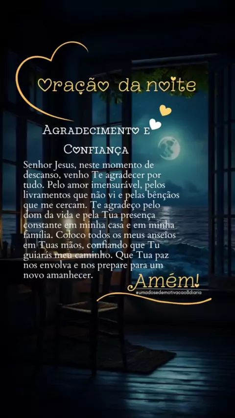 Oração de Gratidão Senhor Jesus, neste momento de descanso, venho Te agradecer por tudo. Pelo amor imensurável, pelos livramentos que não vi e pelas bênçãos que me cercam. Te agradeço pelo dom da vida e pela Tua presença constante em minha casa e em minha família. Coloco todos os meus anseios em Tuas mãos, confiando que Tu guiarás meu caminho. Que Tua paz nos envolva e nos prepare para um novo amanhecer. 🙏✨❤️ Uma linda noite para vocês. 😘❤ Contas parceiras 👇🏻 @umadosedemotivacao8diaria