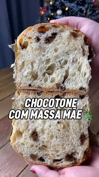 Chocotone feito com fermento natural 🎄 Ingredientes pré fermento: 80g massa mãe 90g leite 65g farinha de trigo Massa: Pré fermento 45g água Pitadinha de fermento biológico seco 50g açúcar 3g sal 190 farinha de trigo 2 gemas Raspas de 1 laranja Essência de baunilha 55g manteiga Frutos secos 40g Gotas de chocolate 50g #panetone #chocotone #fermentacaonatural #panetonefermentaçãonatural