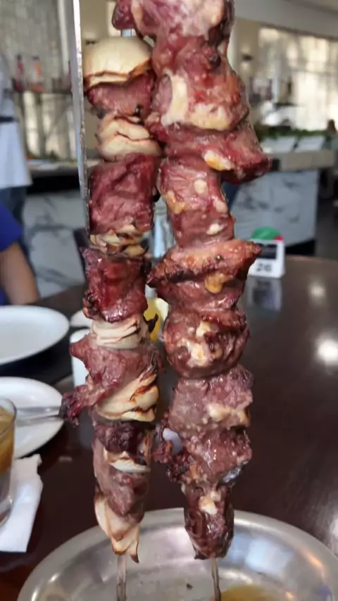 Rodízio de CHURRASCO LIBERADO pela bagatela de R$64,90 pra você colar com os amigos e amassar! O buffet de salada, sushi, massa e frutos do mar também estão inclusos no valor, gurizada! Agora me diz se esse ancho não tava no ponto perfeito? 🤤