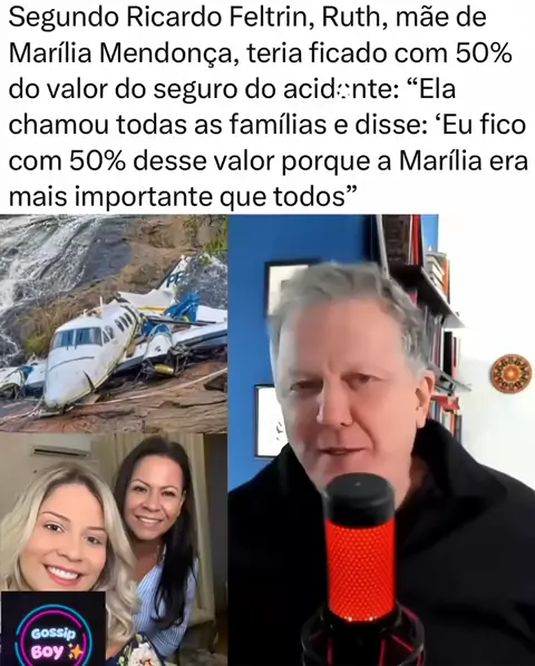 Jornalista Ricardo Feltrin afirma que Ruth Moreira, mãe da cantora vítima de acidente aéreo Marília Mendonça, teria ficado com 50% do valor do seguro da aeronave, sob a justificativa de que todos a bordo estariam ali em função de Marília. O seguro era de 200 mil dólares para cada um.